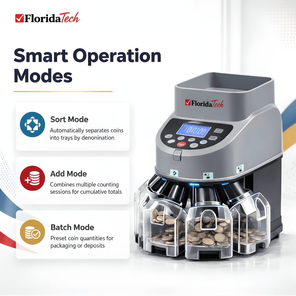 | Multiple Operation Modes | The FL-333 coin counter offers three professional counting modes for different operational needs. |