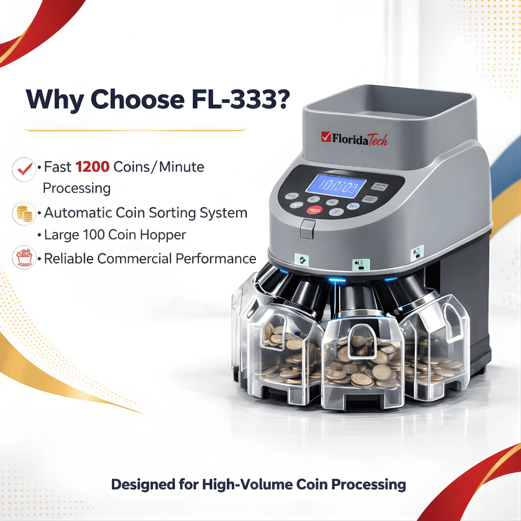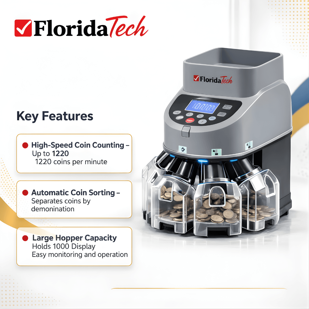 One of the most powerful features of the Florida Tech FL-333 Coin Counter is its ability to process coins at speeds of up to 1200 coins per minute. This significantly reduces the time required to count and organize coins compared to manual methods.