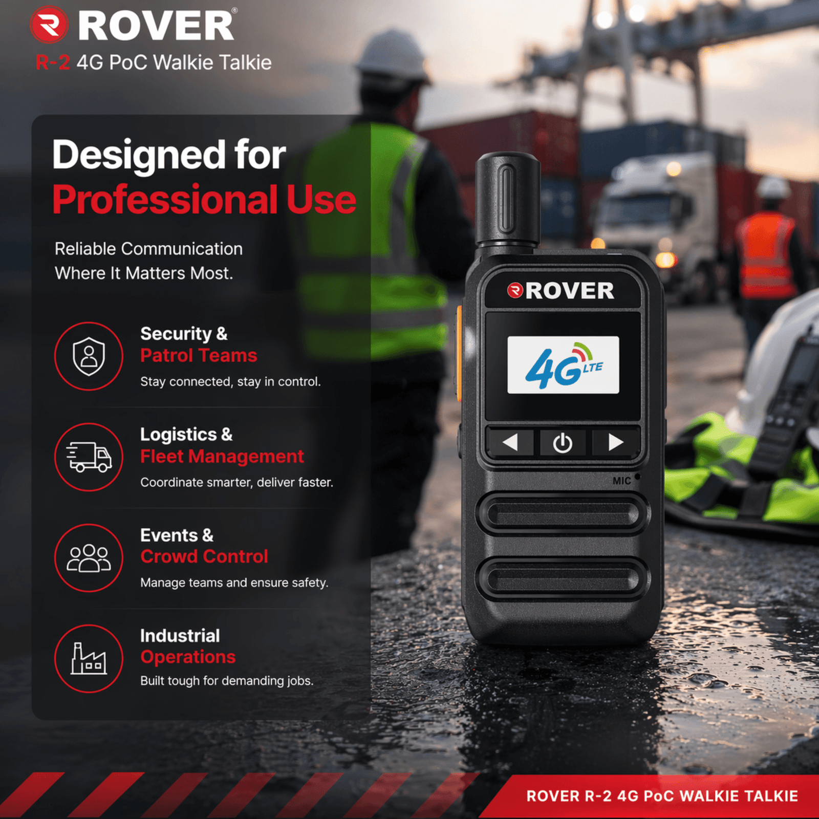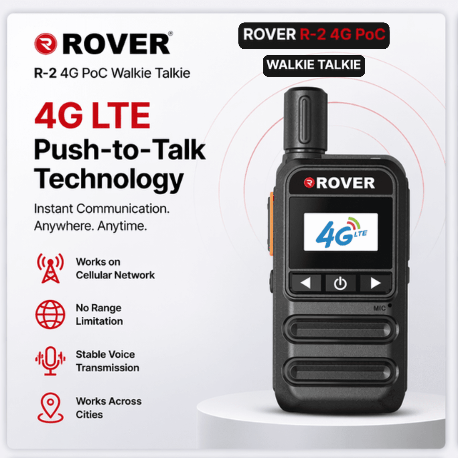 The ROVER R-2 4G PoC LTE is a next-generation two-way communication device designed for security teams, corporate offices, industrial sites, and professional operations. Unlike conventional radios, it leverages 4G LTE cellular networks, enabling instant communication across cities or nationwide without range limitations.