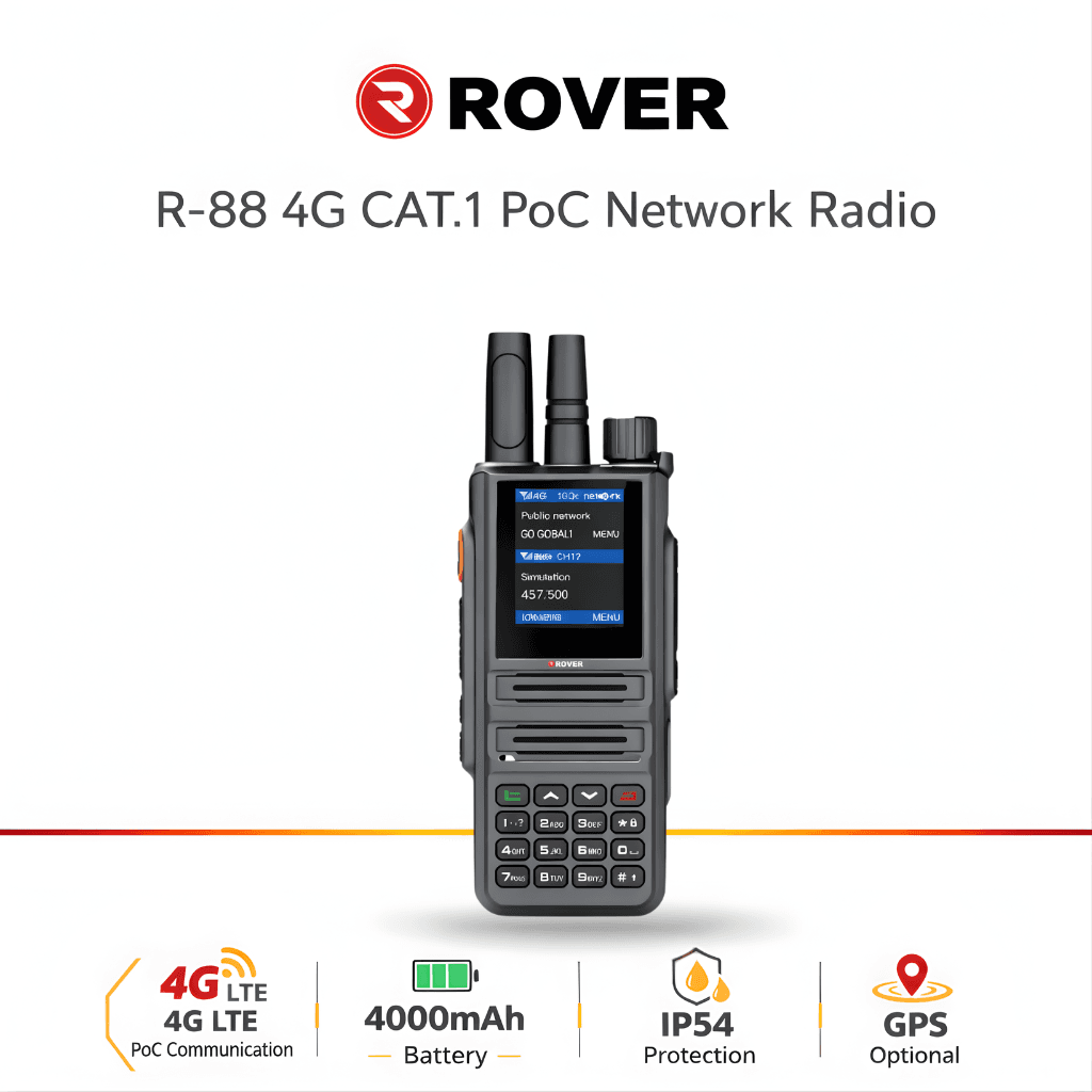 The Rover R-88 4G CAT.1 PoC Network Radio is a professional-grade Push-to-Talk over Cellular (PoC) device designed for wide-area communication using 4G LTE networks. Built for taxi fleets, construction sites, hotels, and large commercial facilities, this IP54 waterproof radio delivers nationwide coverage, private and group calling, and optional GPS positioning. Powered by a high-capacity 4000mAh battery and operating on the POC Global platform, the R-88 4G ensures reliable, uninterrupted communication without traditional radio range limitations.